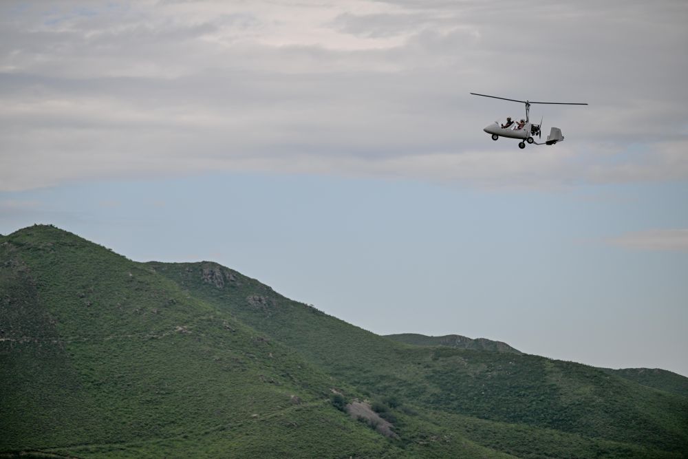 ↑8月8日,游客在内蒙古兴安盟科尔沁右翼前旗乌兰毛都草原乘旋翼机游玩。新华社记者 连振 摄