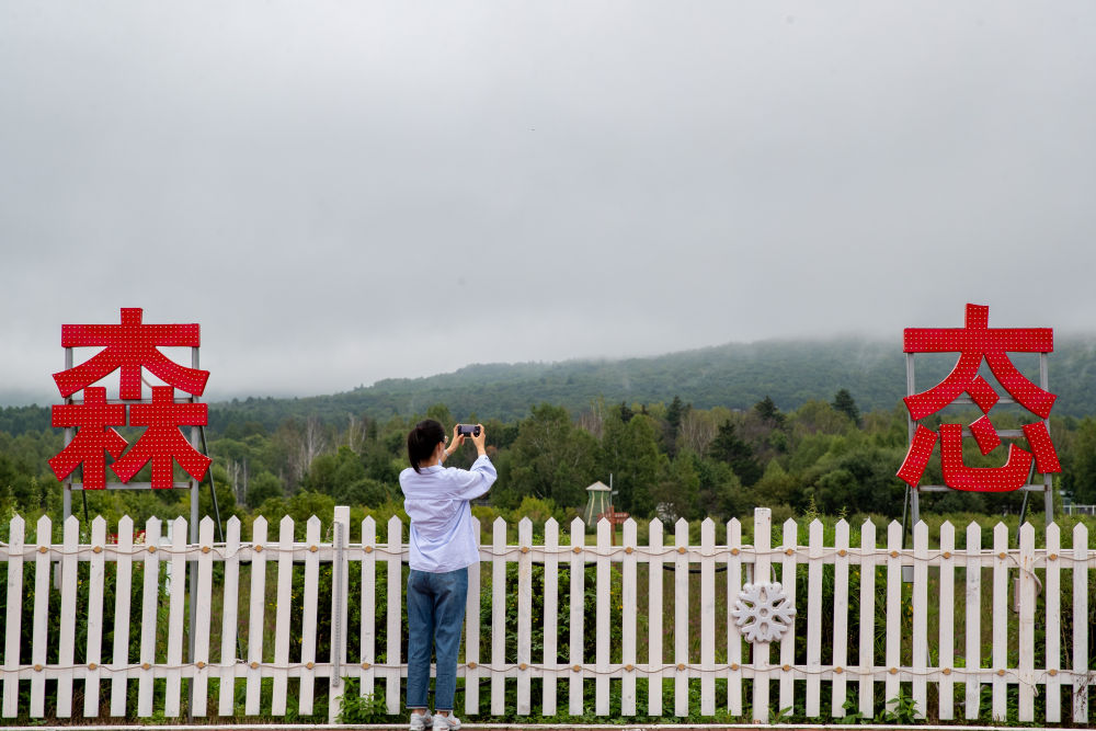 ↑8月27日,游客在黑龙江伊春市上甘岭溪水国家森林公园内拍照。新华社记者 张涛 摄
