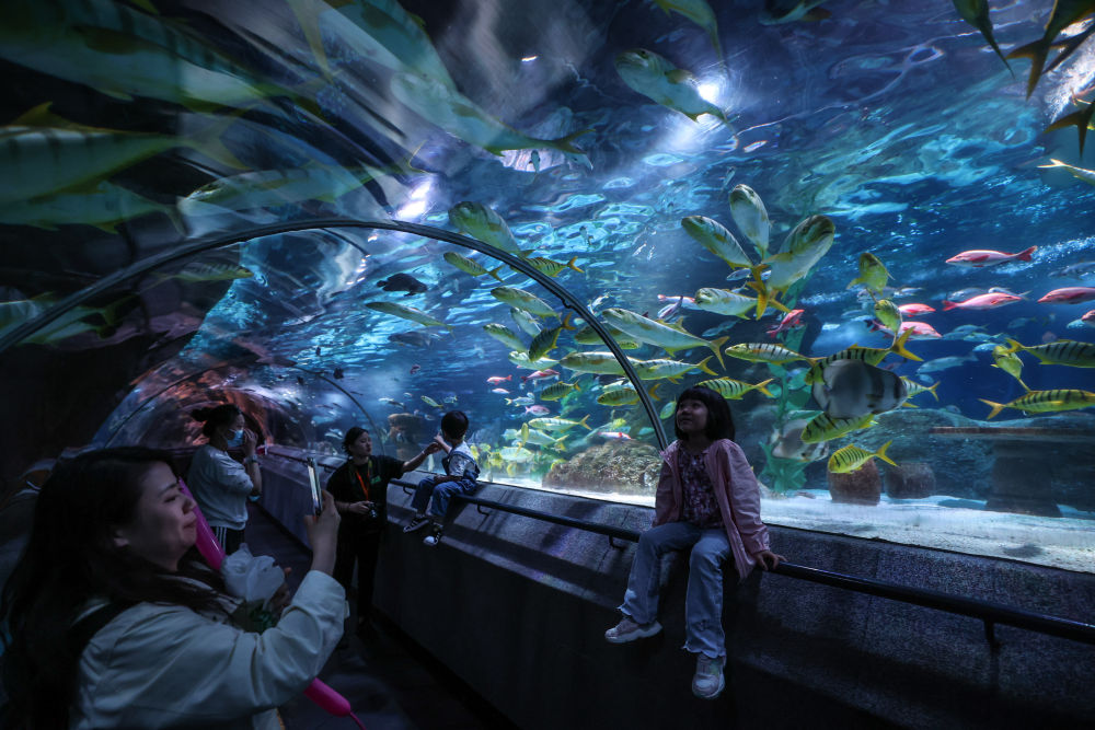 ↑游客在大连圣亚海洋世界观赏海洋鱼类(5月22日摄)。新华社记者 潘昱龙 摄