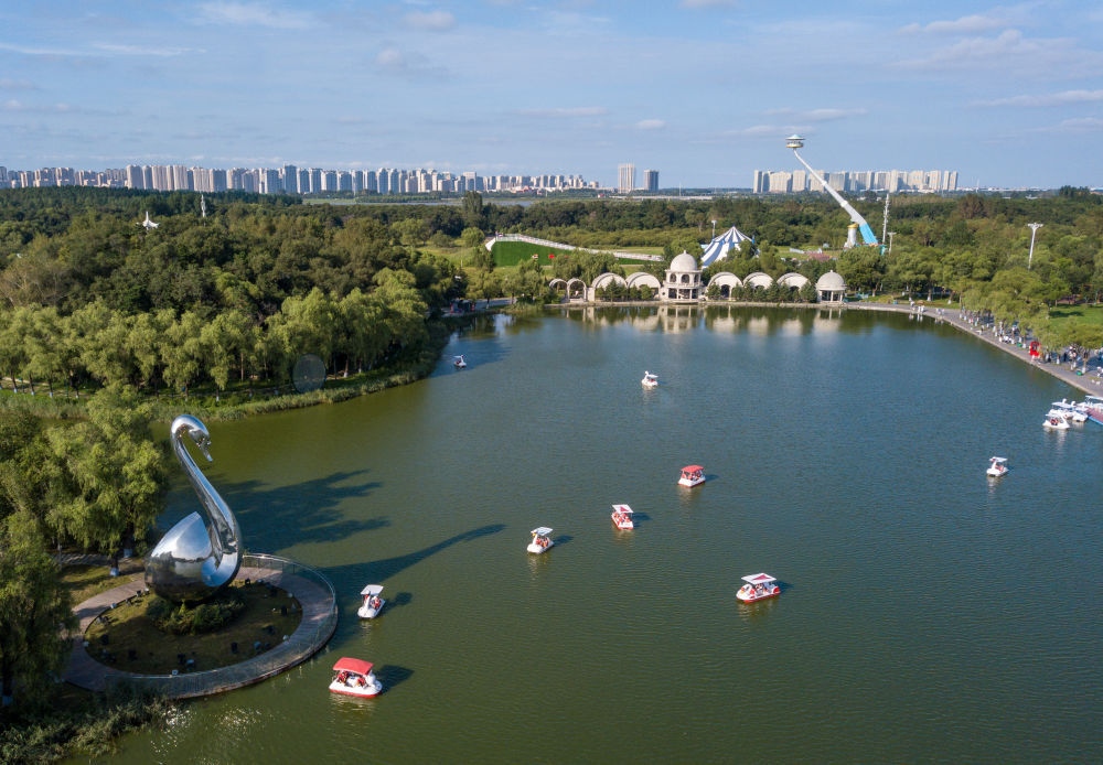 ↑8月20日,游客在黑龙江哈尔滨太阳岛风景区太阳湖上乘船游览(无人机照片)。新华社记者 王建威 摄