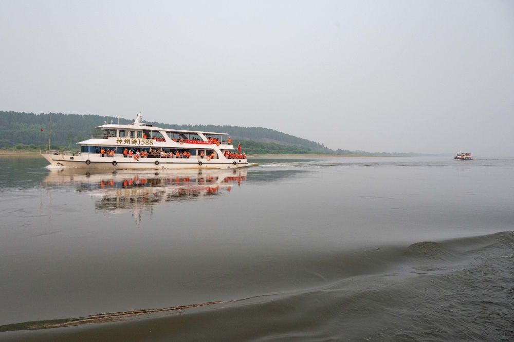 ↑游客从黑龙江省漠河市北极村景区上船,乘船在黑龙江上观光游玩(7月2日摄)。新华社记者 谢剑飞 摄