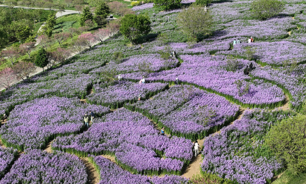↑游客在辽宁大连英歌石植物园游览(5月11日摄,无人机照片)。新华社记者 龙雷 摄