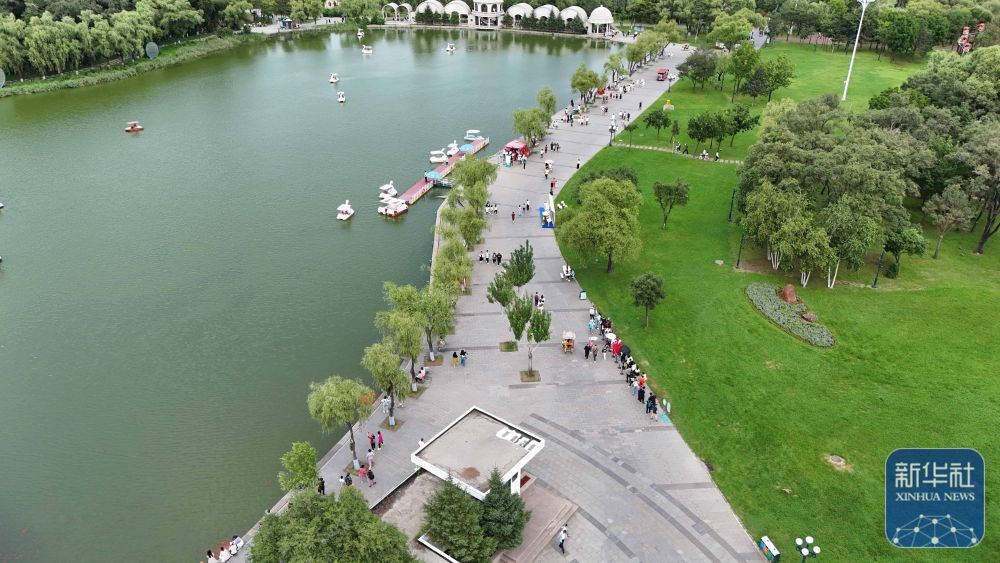 ↑人们在龙江森工集团绥棱林业局生态文化旅游景区一处公园游览(7月25日摄,无人机照片)。新华社记者 谢剑飞 摄