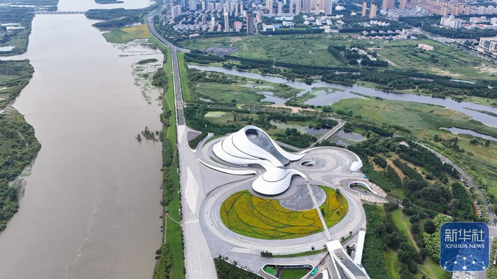 ↑这是哈尔滨大剧院临江景色(8月20日摄,无人机照片)。新华社记者 王松 摄