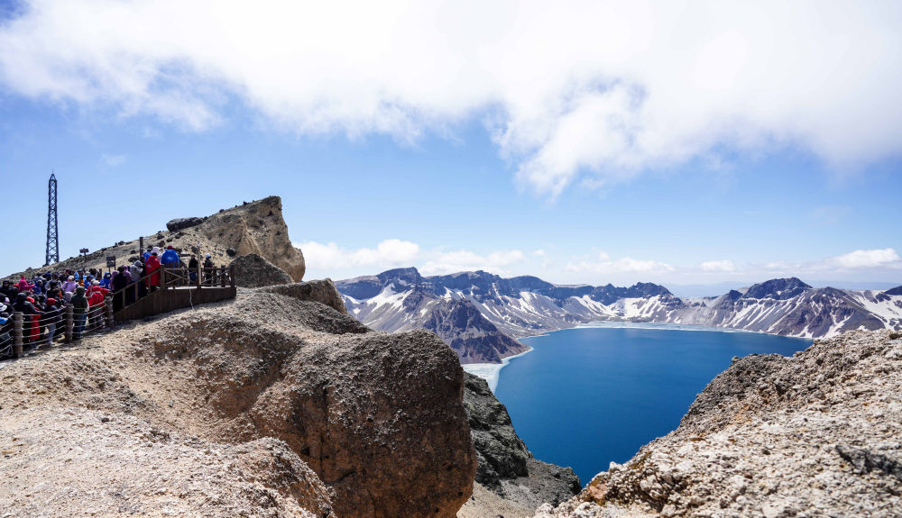 ↑游客在长白山天池景区观赏(5月24日摄)。新华社记者 颜麟蕴 摄