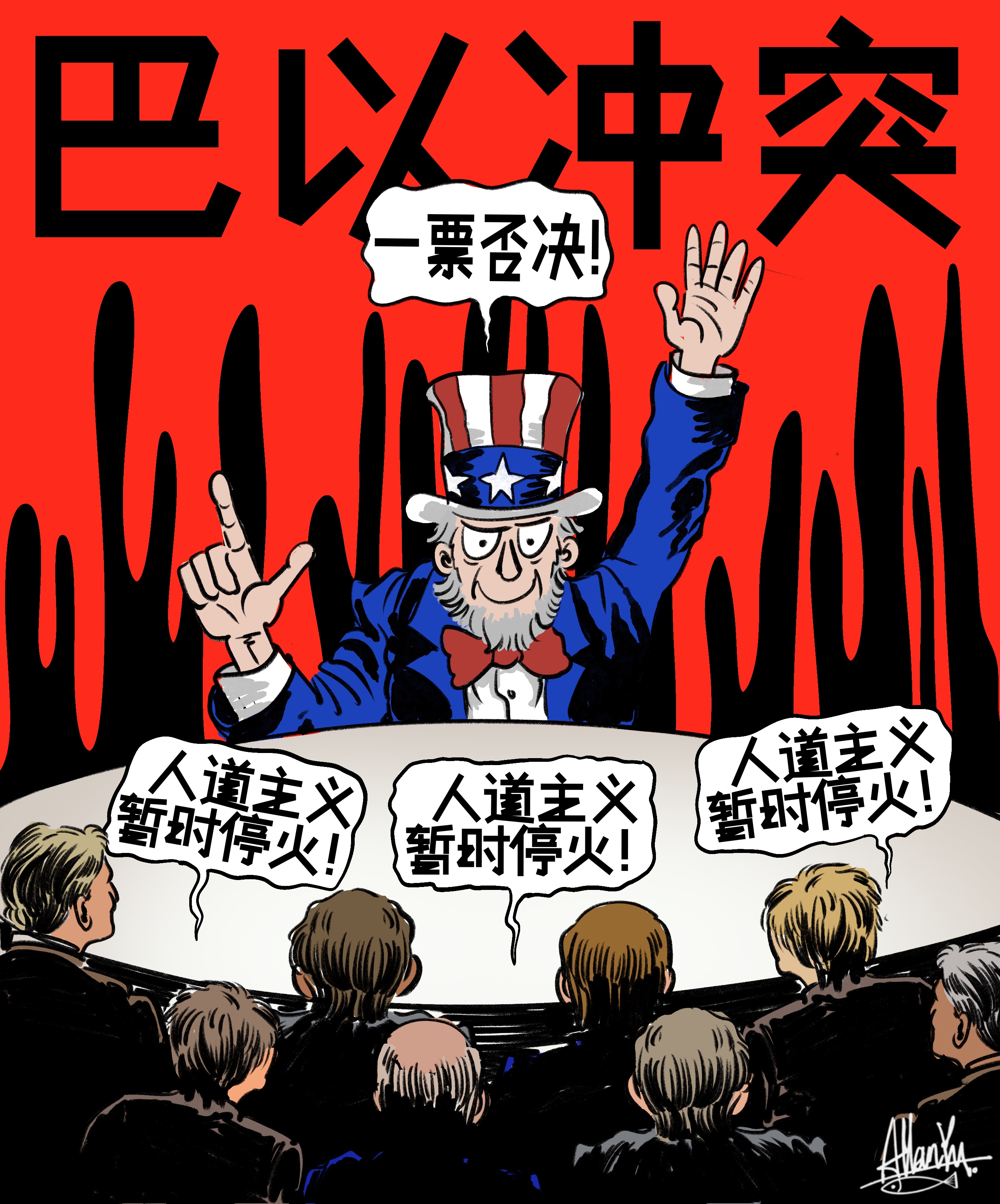 面对不断升级的局势和急剧恶化的人道主义危机,一切旨在推动冲突降级、恢复和平的努力,任何有利于保护平民、缓解人道危机的倡议都应该受到欢迎。然而,一些国家在口头上强调安理会应该采取正确的行动,但其投票立场让人怀疑这些国家根本不希望安理会采取任何行动,不希望真正解决问题。美国阻挠安理会通过巴勒斯坦问题决议草案,对日益严峻的人道主义形势采取冷漠姿态,让普遍希望缓解危机的国际社会失望、遗憾,让仍在冲突中艰难挣扎的民众痛苦、痛心。(漫画:于艾岑;记者:高文成;编辑:叶书宏、樊宇)