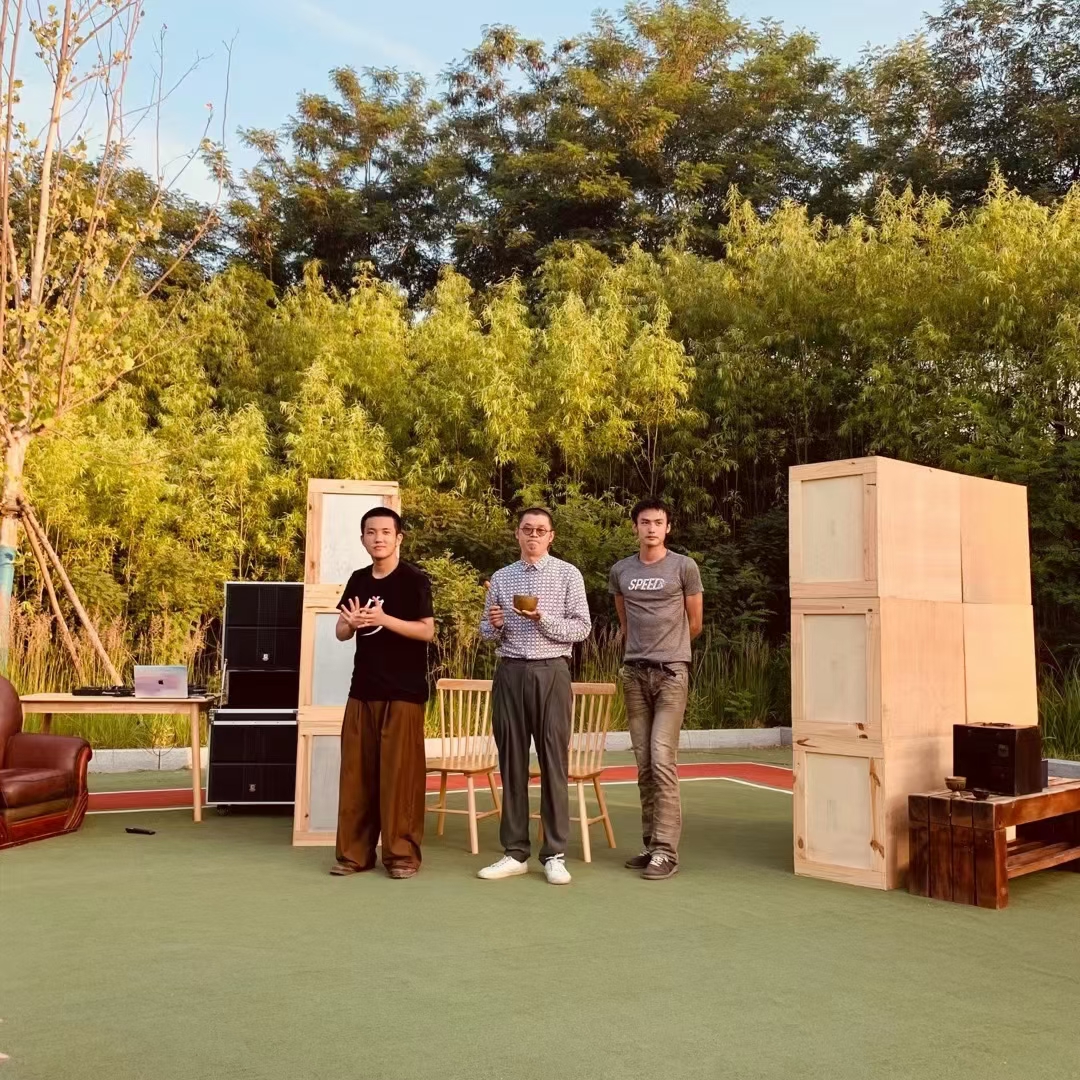 同样在湿地板球场剧场上演的,还有来自成都海龙工作室的剧目《七首诗》,这部作品包含了八首诗、九部戏、十支曲子,融合了荒诞派戏剧与现实主义诗歌。依着六月的树构建舞台,演员读给风的诗,读给天空的诗,在自然里演奏出一段电子乐,读观众的诗。尤为有趣的一点在于,主创团队邀请观众分享各自的诗歌,由衷地希望和观众一起完成剧目的互动环节。导演刘英杰的作品曾入选2022阿那亚候鸟300,谈到此次来到戏剧节的感受,他坦言多少需要一些适应的过程,“在剧中,我有大段台词是散文诗式的独白,一口气演下来非常耗体力,与此同时,当表演空间从剧场变换到大自然中,我需要关注方方面面的变化,这也很考验我的把控能力。”
