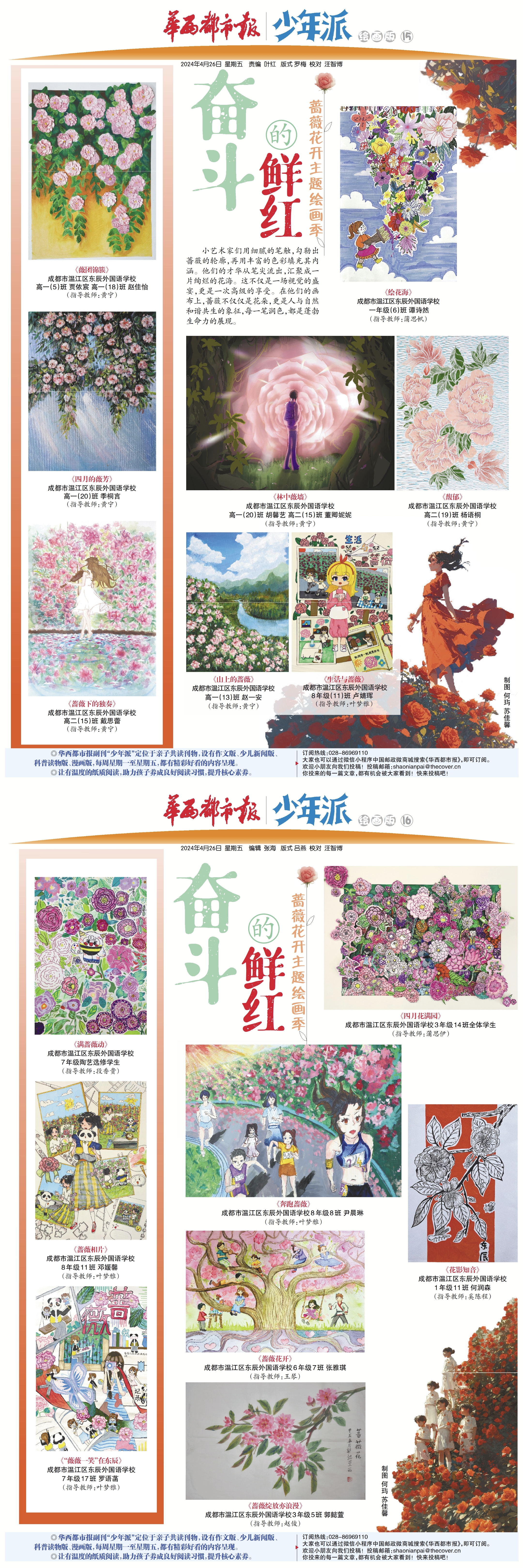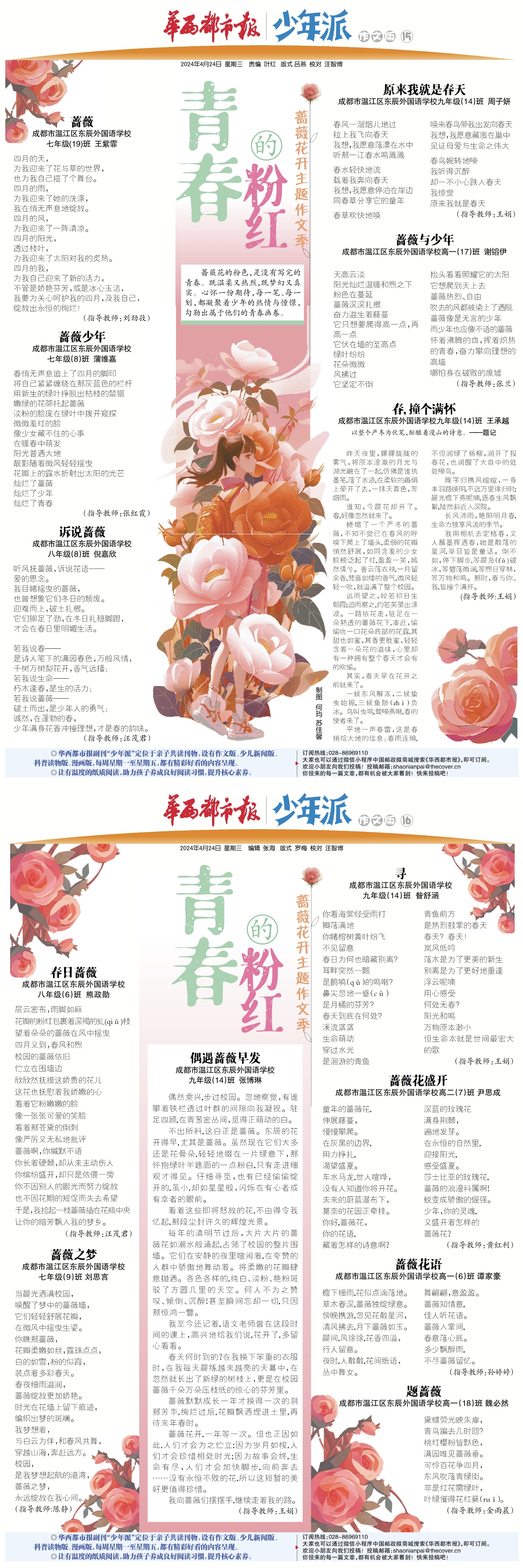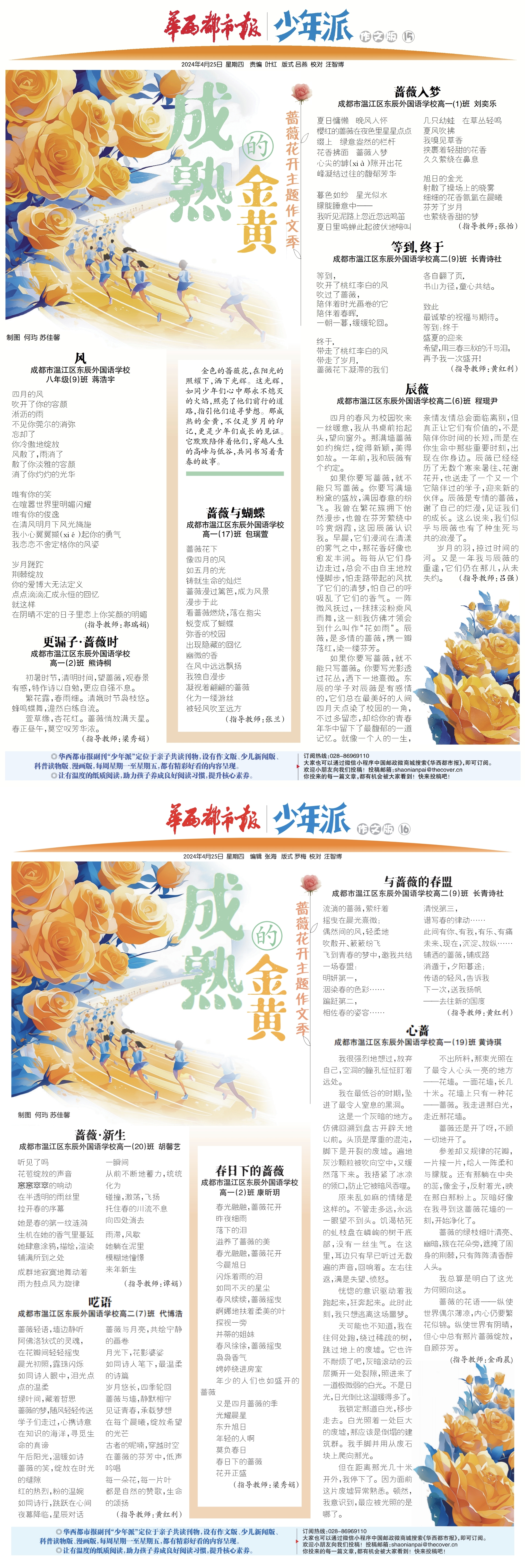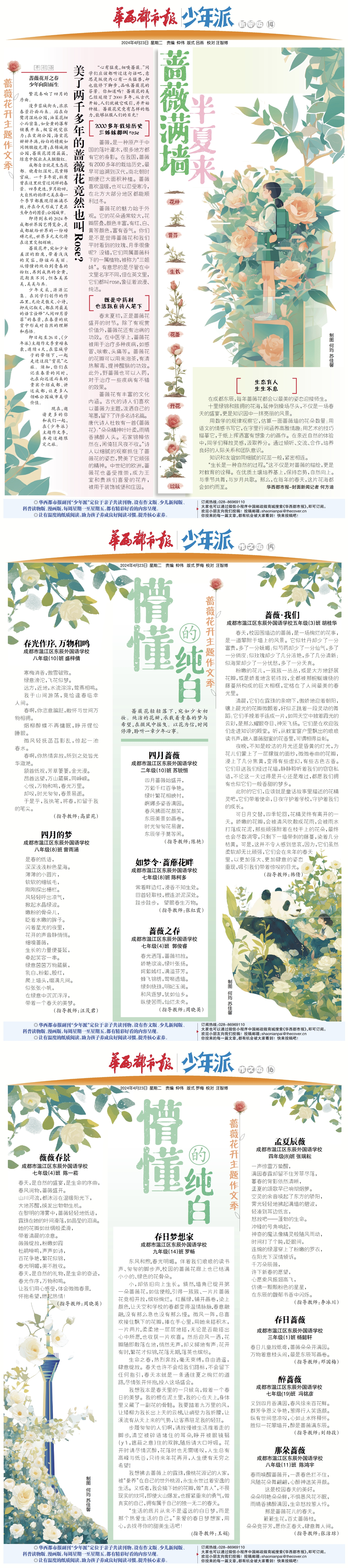 4月26日,华西都市报副刊少年派蔷薇花开主题作文季迎来终幕,来自成都东辰的同学们以细腻的观察,真挚的情感,在为期4天的连载中,以“懵懂的纯白”“青春的粉红”“成熟的金黄”“奋斗的鲜红”为主题,创作了大量有关春景的散文、诗歌及绘画作品。