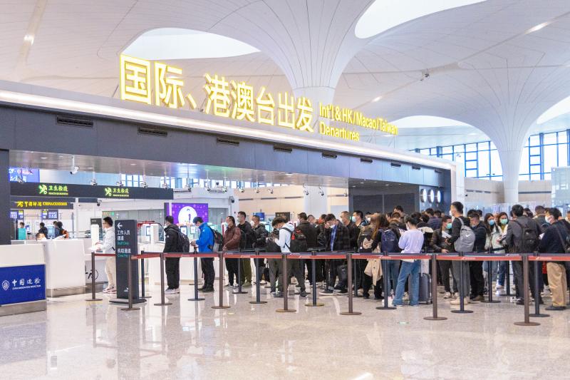 2月8日,准备前往印尼巴厘岛的旅客在杭州萧山国际机场T4航站楼排队等待。新华社发(龙巍摄)