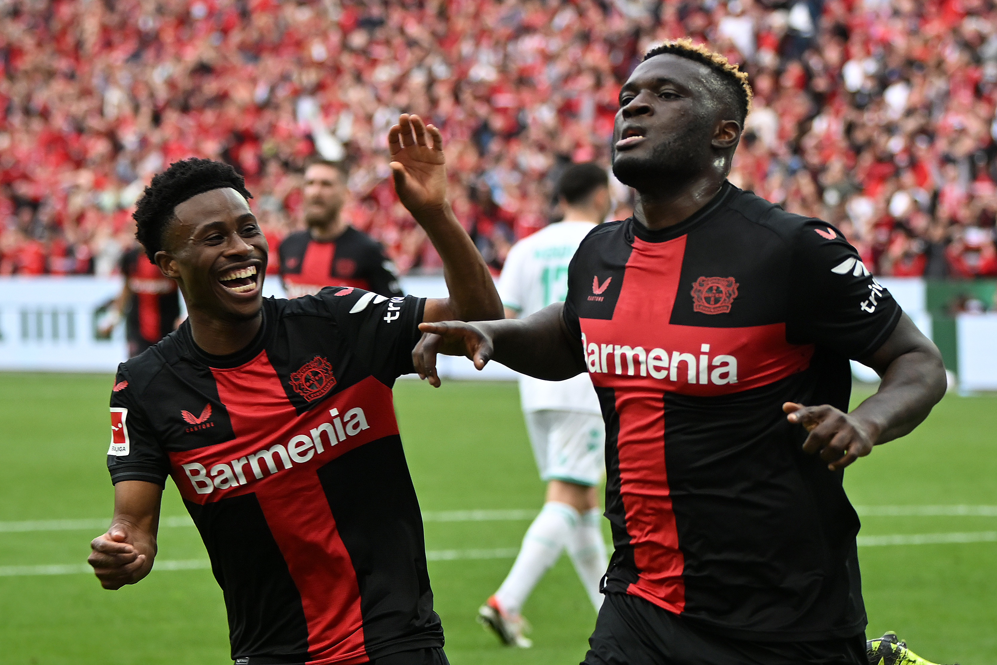 4月14日,勒沃库森队球员博尼法斯(右)进球后庆祝。新华社发(乌尔里希·胡夫纳格尔 摄)