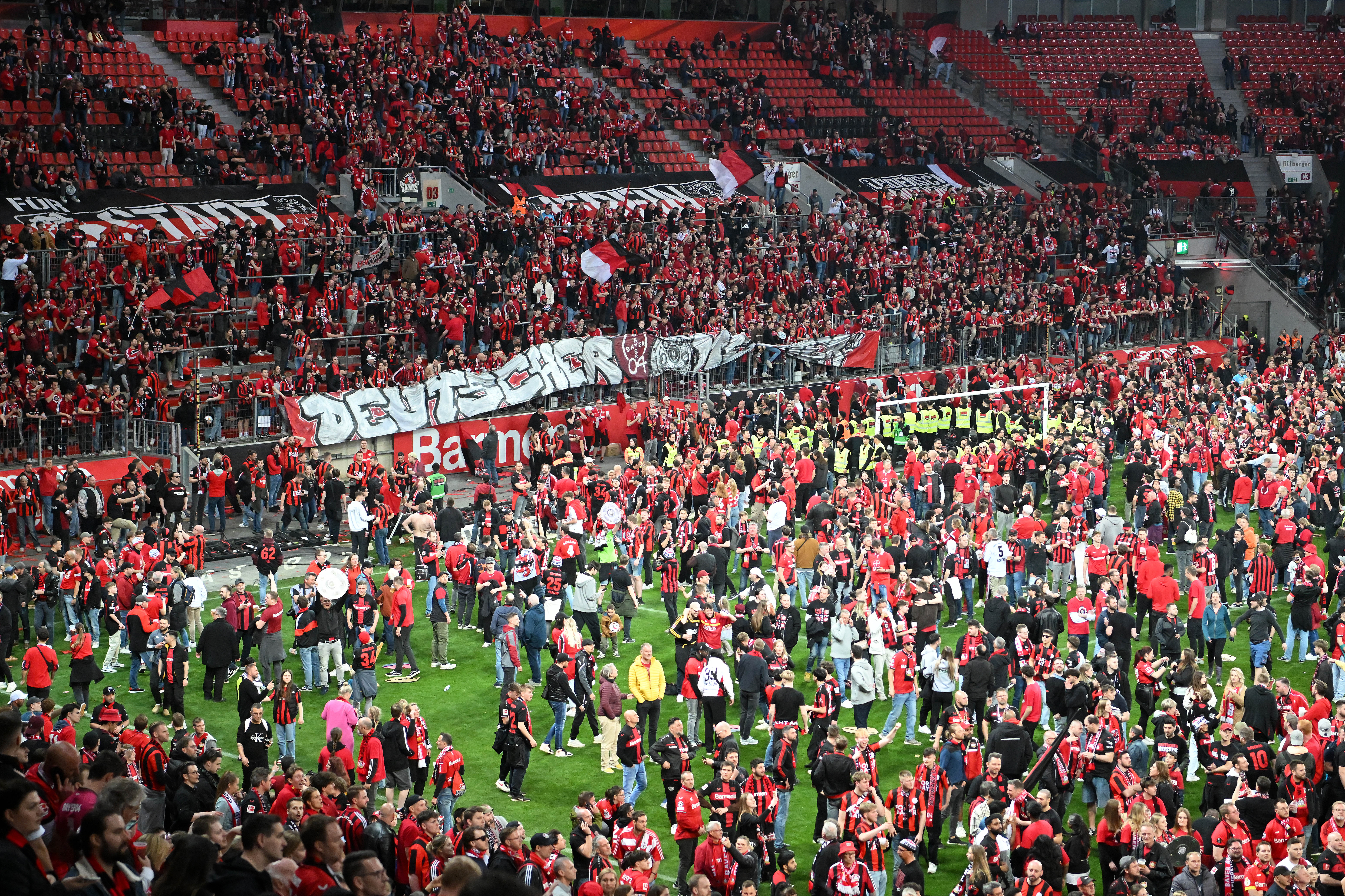 赛后,激动的勒沃库森球迷纷纷冲进球场内,和球员一同高歌庆祝队史首个德甲冠军,球场成了红黑色的海洋。