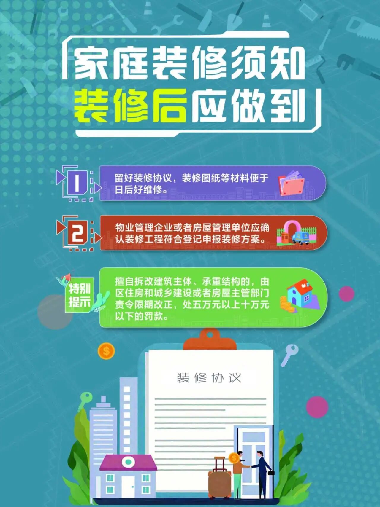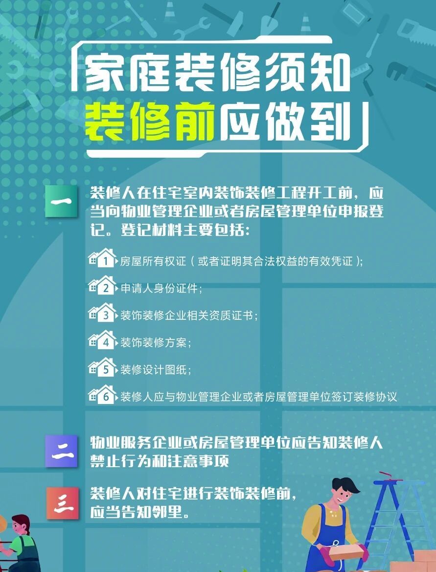 同时,物业或房屋管理单位会告知禁止行为和注意事项,装修人也别忘了提前跟邻里打声招呼,并为装修人员办理小区出入证等。