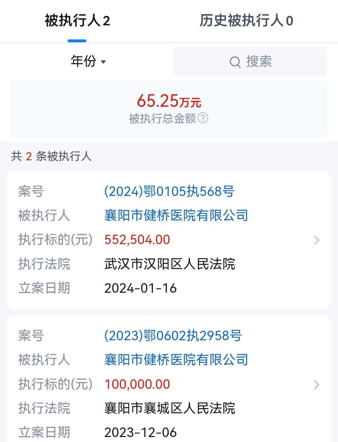 1月6日,健桥医院与某医药集团合同纠纷,未按时履行法定义务,被武汉市汉阳区人民法院强制执行55.2万元。一个月前,该医院因同样的原因,曾被襄阳市襄城区人民法院强制执行10万元。