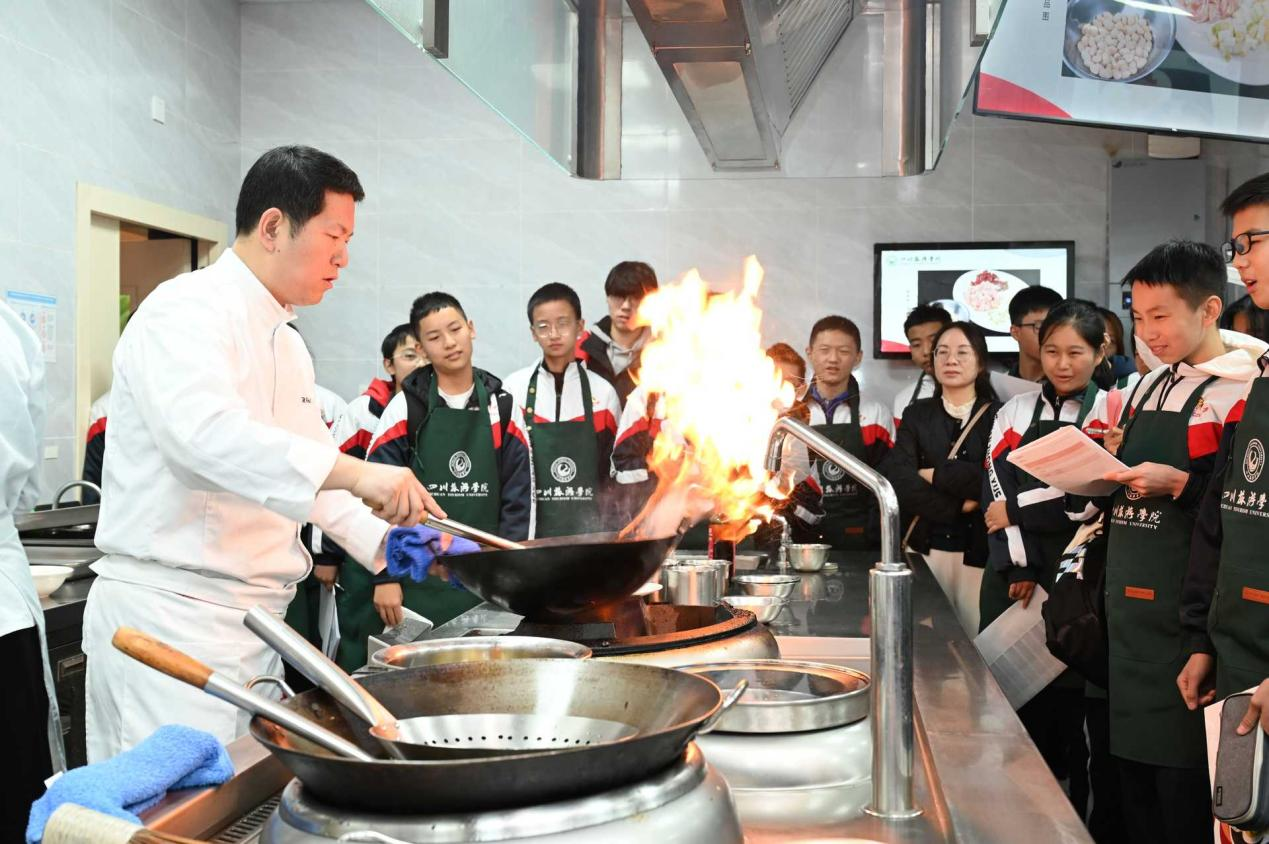 “看,这是我们做的麻婆豆腐!”11月21日上午,来自成都西川中学的师生们走进四川旅游学院,开展了一场以“蜀娃探蜀味·匠道育知行”为主题的食育教育研学活动。本次活动旨在将巴蜀美食文化、劳动教育与生活实践深度融合,引领学生在沉浸式体验中探寻饮食文化根源,锤炼劳动品格,感悟匠心精神。