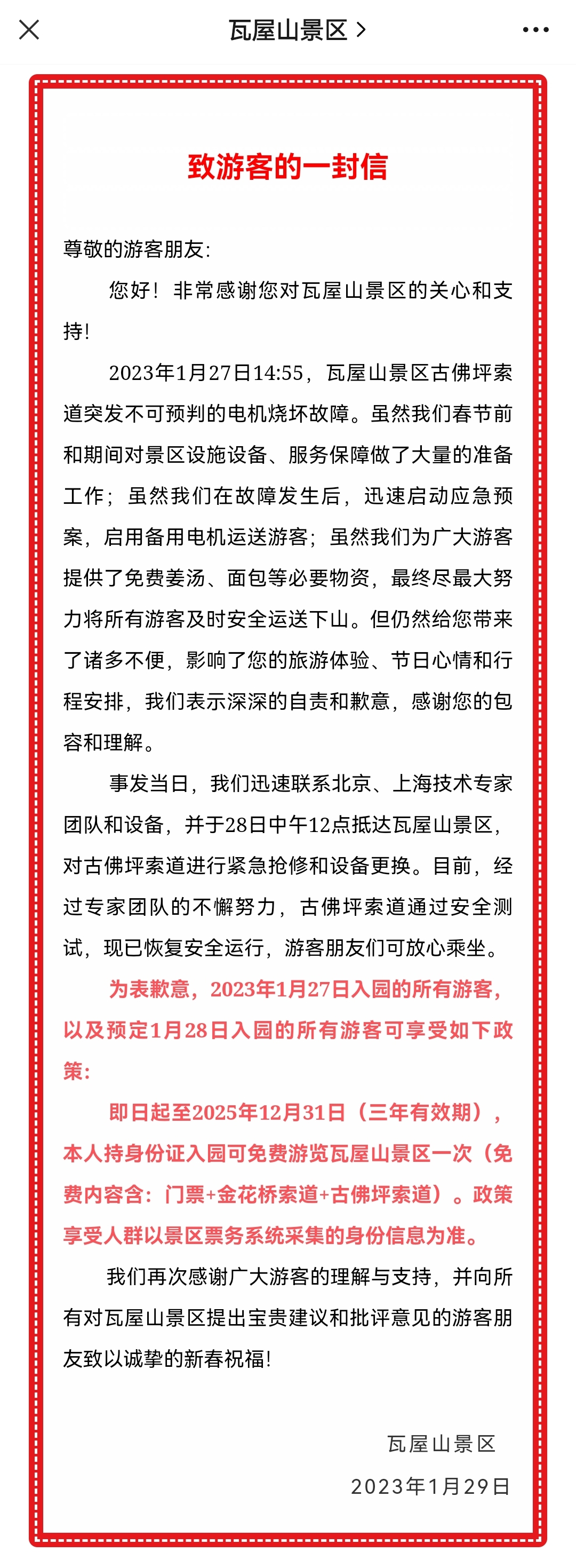 瓦屋山景区1月29日发布的《致游客的一封信》