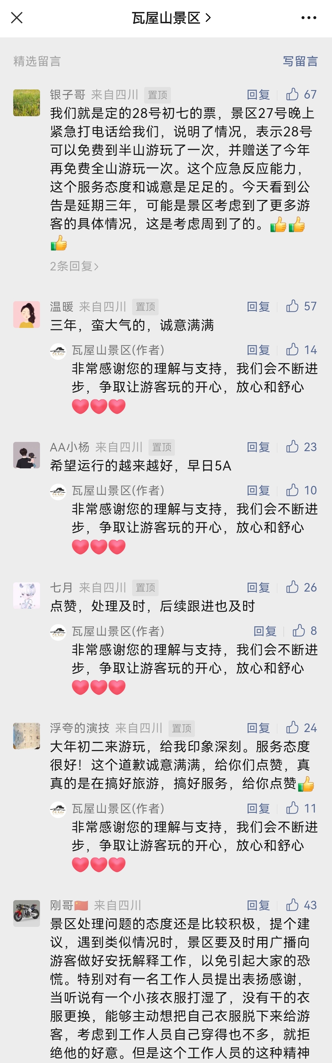 记者注意到,在瓦屋山景区官方微信公众号1月29日发布的通知下方,不少游客在留言区分享了1月27日和28日的经历,并对景区积极处理突发事件的态度和措施点赞。