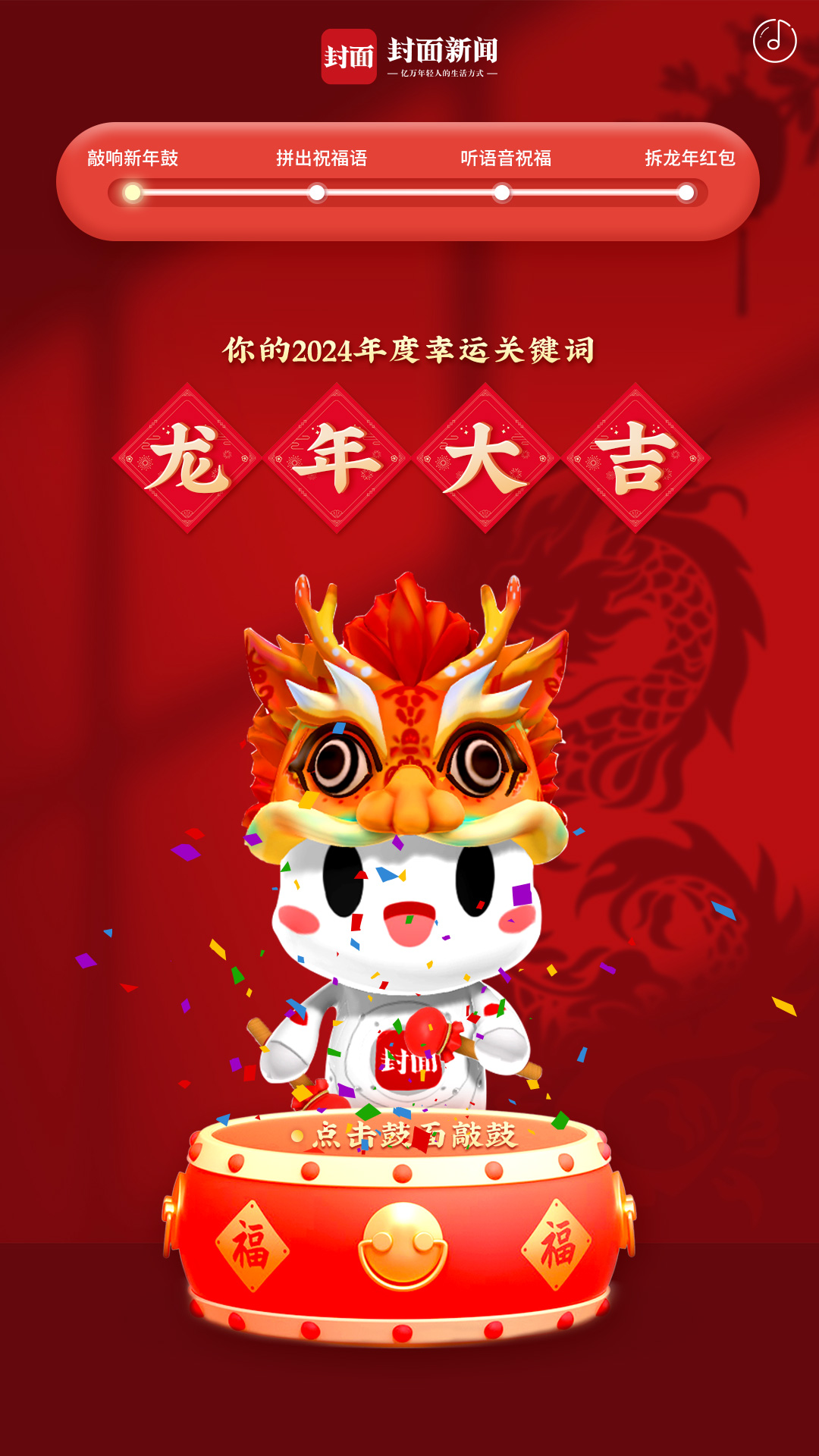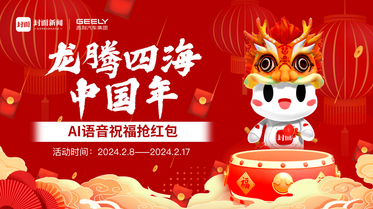 龙腾四海中国年,欢天喜地庆团圆。@所有封面新闻的小伙伴们,今年春节,记得来封面新闻“龙腾四海中国年 AI语音祝福抢红包”活动哦,这里,有现金红包、有集市好礼,还有封面新闻对你最真挚的祝福。最后,祝所有小伙伴们,春节快乐,龙年大吉。