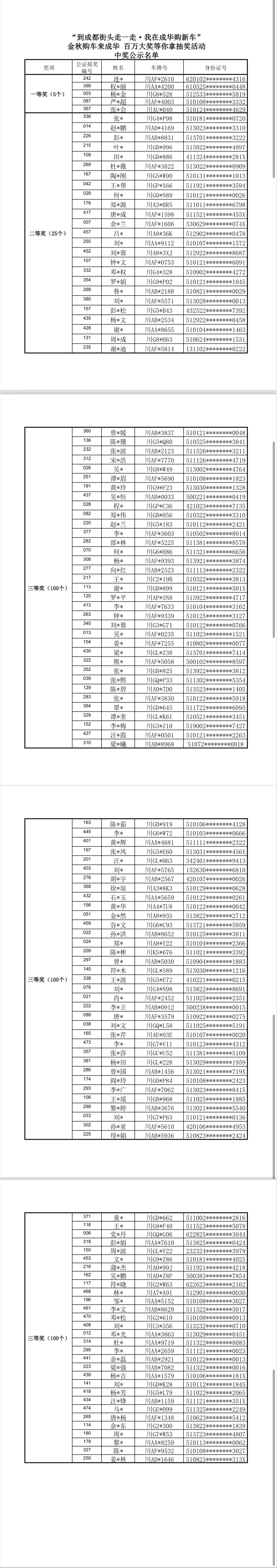 10月20日,在成华区相关政府部门、车企代表、购车车主代表、媒体代表的共同见证下,在成都市律政公证处的公证下,130名幸运中奖人名单出炉,其中一等奖5个,每个5万元;二等奖25个,每个1万元;三等奖100个,每个5000元。