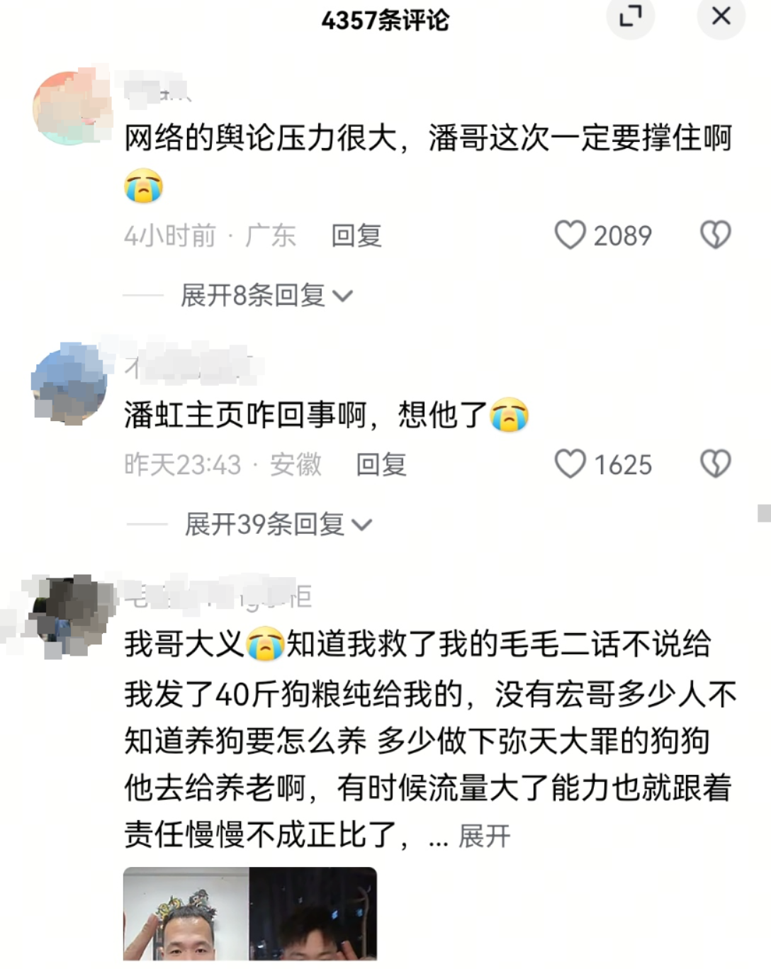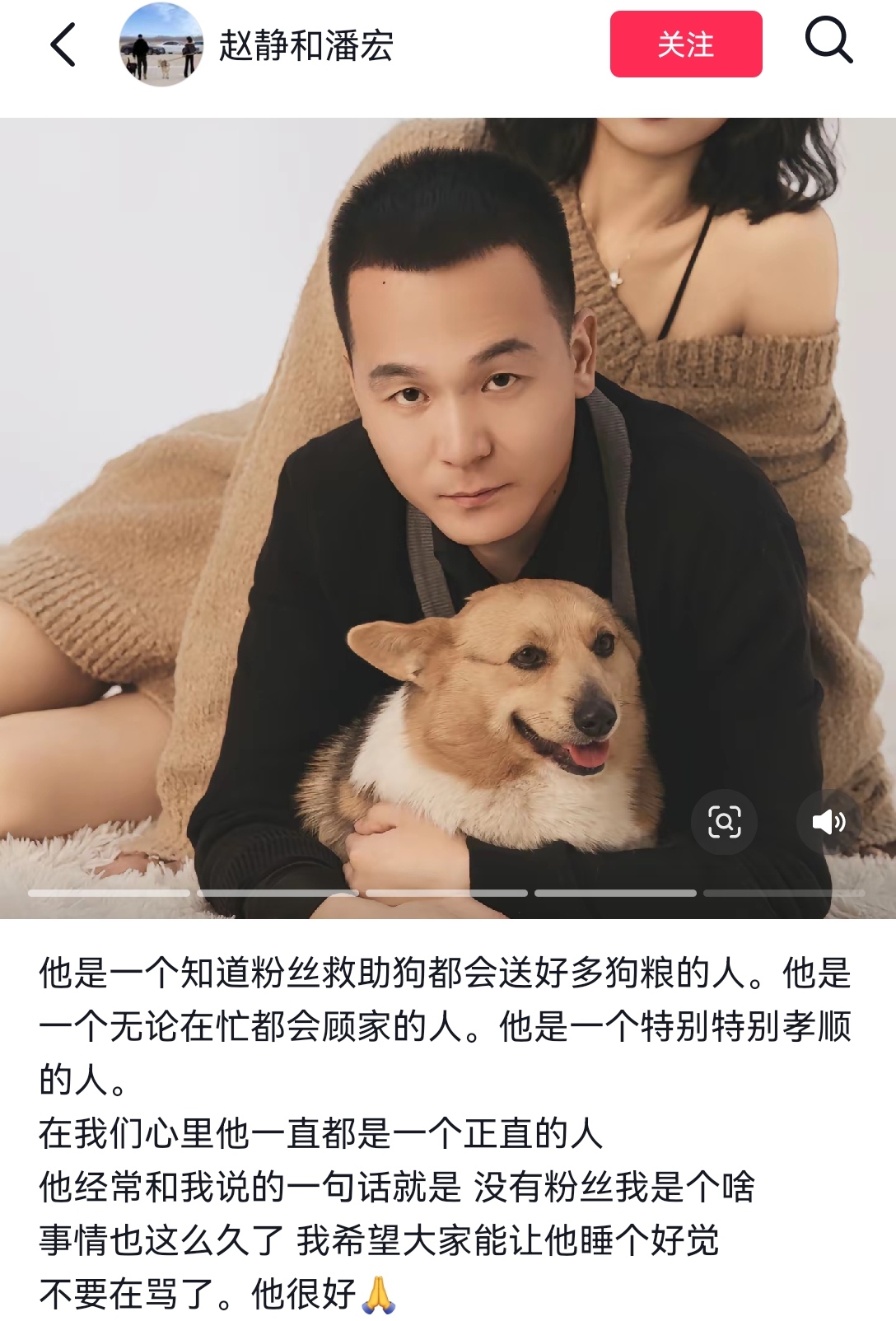 其妻子在账号更新内容中,称潘宏是个正直、孝顺、顾家的人,知道粉丝救了狗,会发很多狗粮给对方,经常说“没有粉丝我是个啥”,希望大家让他睡个好觉,不要再骂了。视频配音为“后来我想明白了,太阳也不能让所有人都喜欢”。