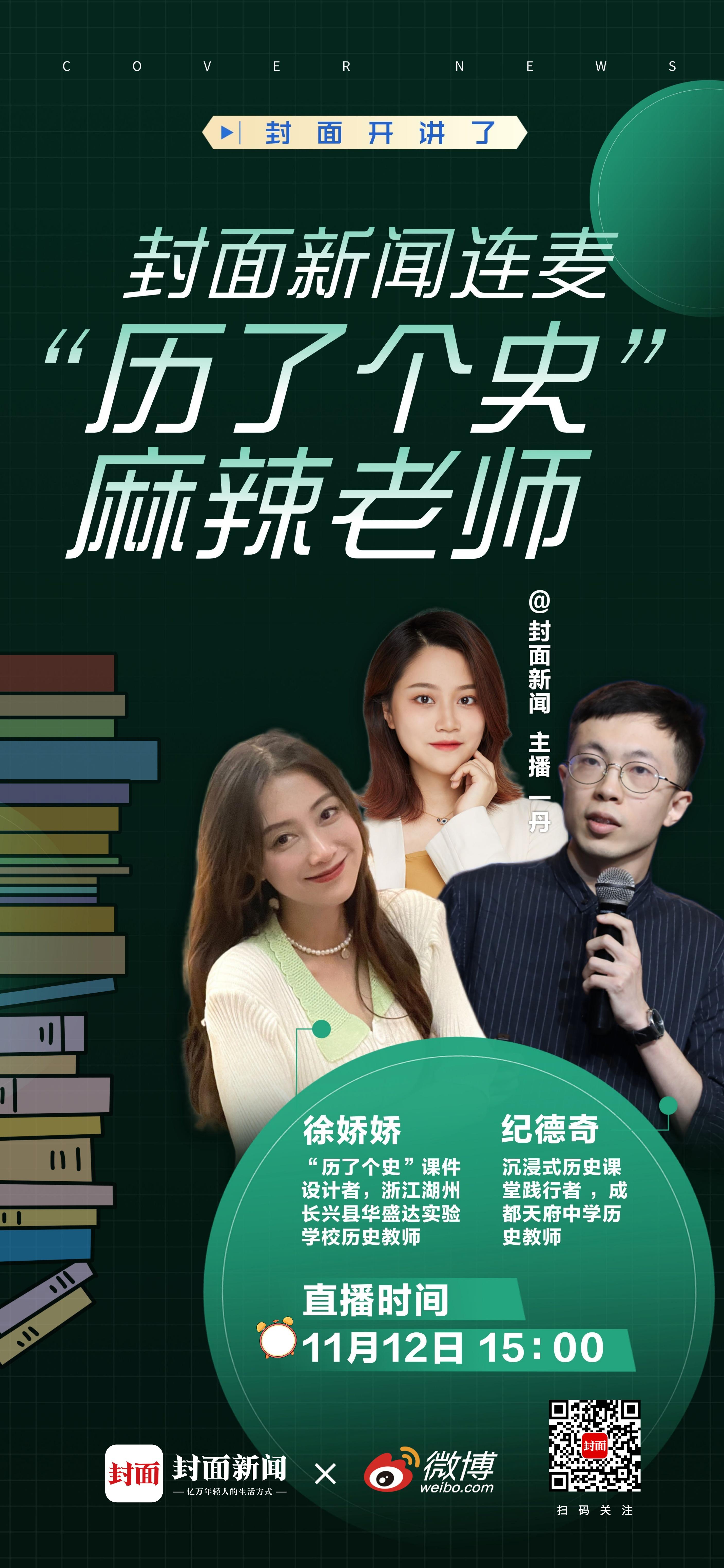 从“羊了个羊”到“历了个史”,展示的其实是一种课堂新气象。11月12日(周六)下午3:00,“封面开讲了”,封面新闻主播一丹微博连麦创新“历了个史”的浙江湖州长兴县华盛达实验学校高中历史老师徐娇娇,以及来自天府中学的历史老师纪德奇,分享个性化历史教学。两位老师一位教高中历史,一位教初中历史,但都擅长在课堂上创新。在一个多小时的连麦中,20多万网友在线聆听,一位网友留言:“好想回来上历史课!”表达了大家的心声。