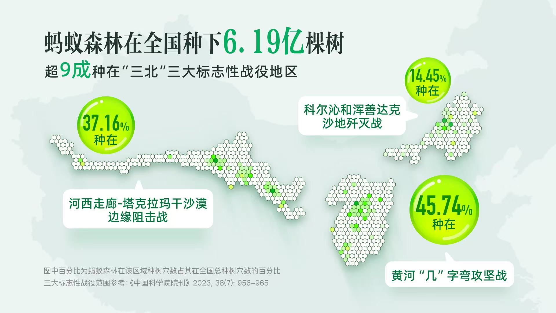 在生态修复方面——蚂蚁森林在内蒙古、甘肃、河北、陕西、青海、宁夏、新疆等13个省份已种下超6.19亿棵树,种植总面积4366平方公里,相当于中国八大沙漠之一——乌兰布和沙漠面积的一半。90%以上的蚂蚁森林种在了“三北”工程三大标志性战役核心地区,助力当地的荒漠化治理和防沙治沙工作。