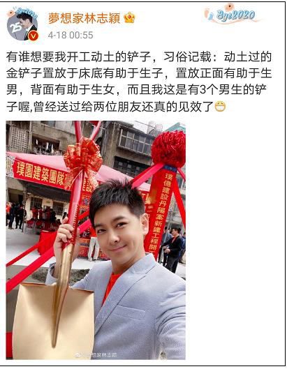 不过,去年林志颖因一番迷惑言论冲上热搜。其所谓“动土过的金铲子置放于床底有助于生子”的习俗,与似乎特意强调“我这是有3个儿子的铲子”的说明,引发舆论争议。