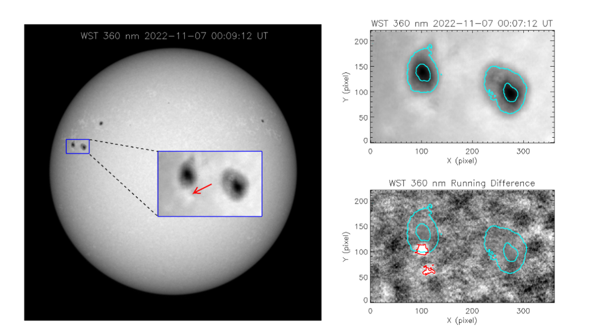 图6展示的是2022年12月3日LST上的太阳白光望远镜(WST)观测到的一个比较罕见的边缘白光耀斑,SDI同时观测到莱曼阿尔法辐射增亮。这些结果表明LST上的WST和SDI具备了科学观测的能力,所得结果为随后详细研究日珥莱曼阿尔法波段演化及多波段诊断白光耀斑特征提供了宝贵的资料。