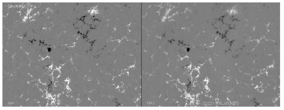 图1展示的是全日面矢量磁像仪(FMG)在轨观测的局部单色像和磁图,以及与怀柔地面全日面磁场望远镜对同一时间同一日面区域观测的结果对比。图2展示的是2022年11月6日00:50:15UT FMG观测到的局部纵向磁图与同一时间国际上最先进的HMI/SDO观测结果的对比。结果显示,FMG的观测效果远远好于地面望远镜;在反映局部纵向磁场细节上,FMG与国际上最先进的HMI/SDO几乎完全一致。