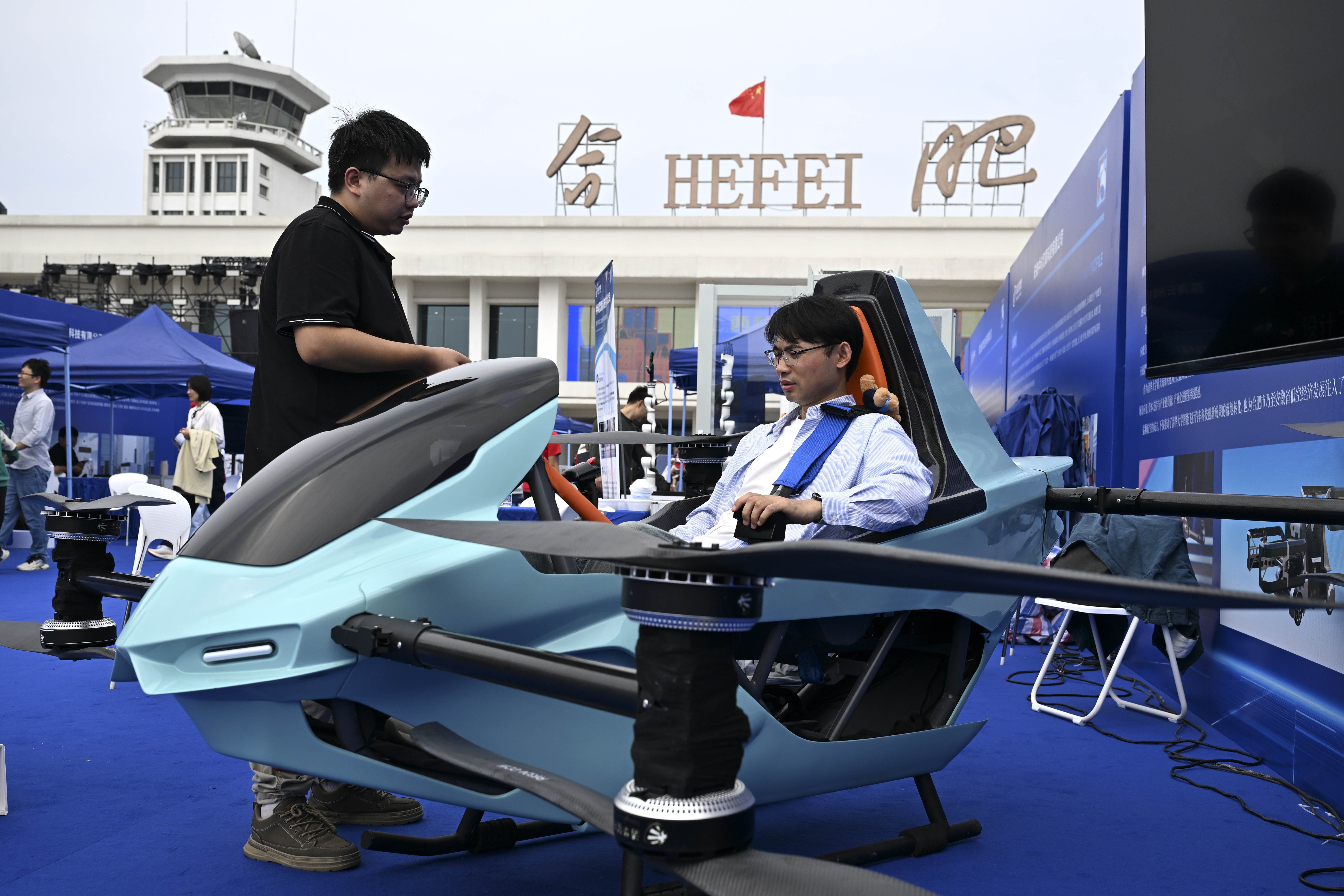 2025年9月21日,观众在2025世界制造业大会“全空间无人体系成果展”上体验由安徽猛狮航空科技有限公司展出的一款无人驾驶飞行摩托。新华社记者 黄博涵 摄