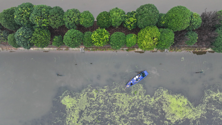 2025年10月30日,蟹农在湖南益阳大通湖区河坝镇捕捞大闸蟹(无人机照片)。新华社记者 陈振海 摄