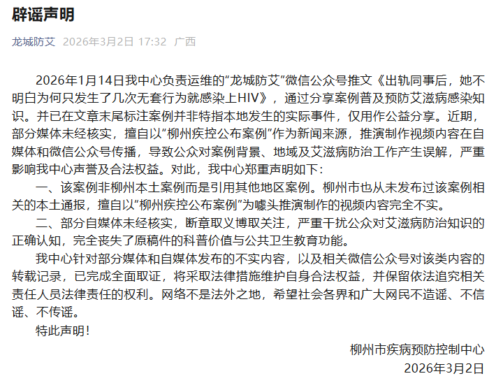 3月2日,柳州市疾病预防控制中心发布辟谣声明称,该中心于1月14日在“龙城防艾”微信公众号发布的防艾科普推文《出轨同事后,她不明白为何只发生了几次无套行为就感染上HIV》,文中所分享的HIV感染案例均为引用其他地区的案例,并非柳州本土案例,且文章末尾已明确标注该案例仅用作公益科普分享、并非本地实际发生的事件。网传“柳州疾控公布当地HIV感染案例”等信息均不属实。