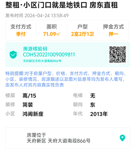 近期,成都住建部门发现个别互联网平台存在房源信息违规问题,已开展行业整治并发布风险提示,提醒市民防范线上找房风险。全文如下: