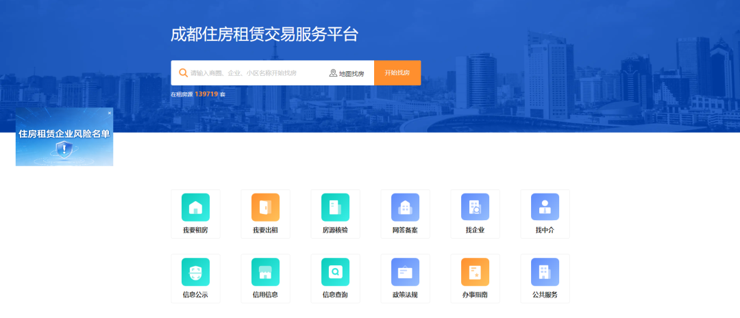 二、注意查看住房租赁企业、房地产经纪机构信息。可通过“成都住房租赁交易服务平台”(https : // zw.cdzjryb.com/funi-trading-web/),查看企业及从业人员信息,选择市场信誉度较好、信用等级较高的住房租赁企业、房地产经纪机构,避免遭遇“黑中介”和“不良中介”。