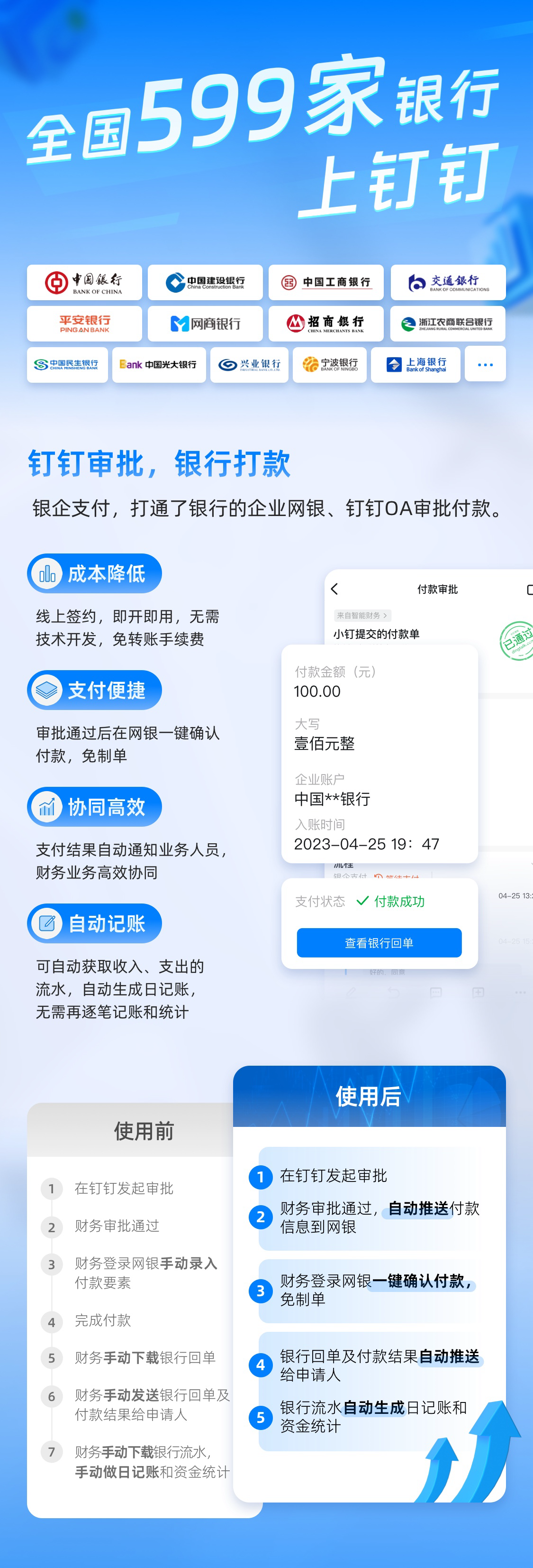 钉钉银企支付产品,低门槛地打通了银行的企业网银与钉钉OA审批付款流程,企业无需定制开发,即可开箱即用。企业也可通过将财务、ERP等内部系统与钉钉OA审批连接,实现业务系统、审批、付款的一站式管理,让企业资金管理省心省事。