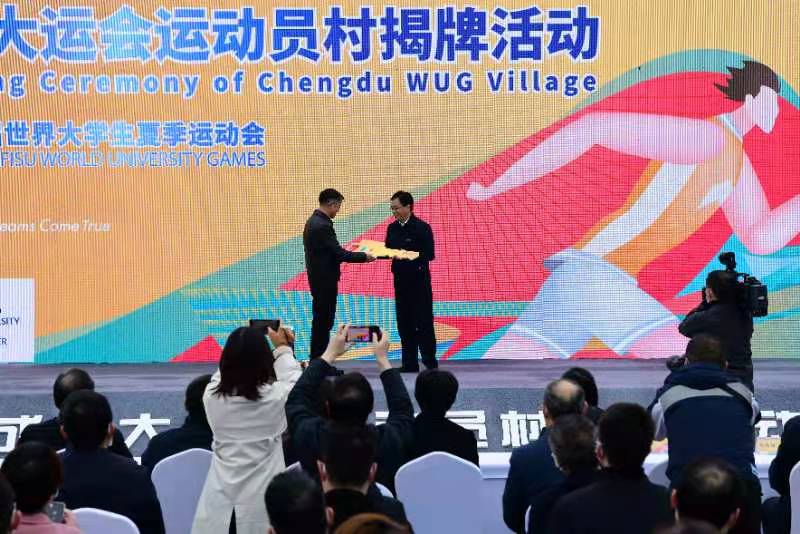 大运村揭牌活动在大运村升旗广场举行,这也标志着作为成都大运会“迎宾馆”的大运村首次亮相。活动中,建设单位成都城投集团向大运村村委会交付钥匙。