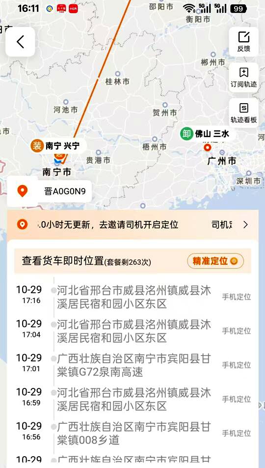 “干这行20年了,我从未遇到过车辆失联、目的地偏离的事。”这家中介企业员工刘女士告诉记者,10月29日,她受老顾客高先生的委托,通过货运平台“运满满”下单送货。经平台派发,找到了车牌号为“晋A0G0N9”的货车,货物为7.8吨冷冻猪脚,起始地广西南宁,目的地广东佛山。