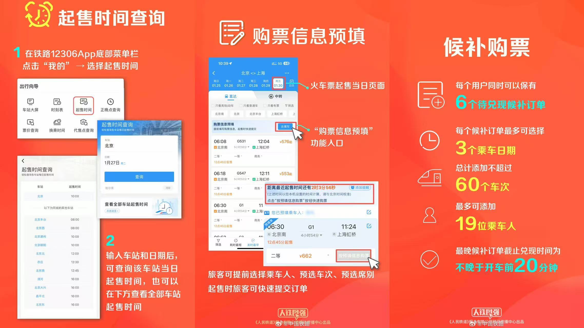 为2026届高校毕业生异地求职增加2次优惠购票次数,继续为学生、务工人员提供预约购票服务。铁路12306客服中心新增60周岁及以上老年人电话购票受理服务。