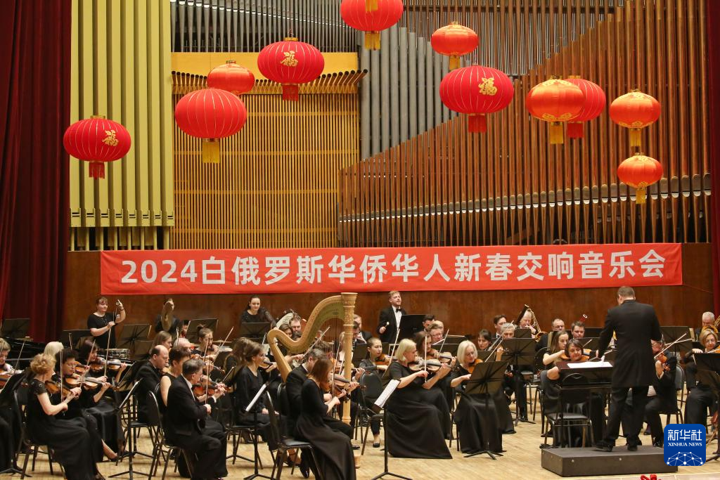 2024“温暖迎春·共庆中国年”白俄罗斯华侨华人新春交响音乐会2日晚在白俄罗斯国家音乐厅举办。音乐会以中国传统舞龙舞狮表演开场,中白两国音乐家联袂为观众奉献了《春节序曲》《库里安协奏曲》等经典曲目。