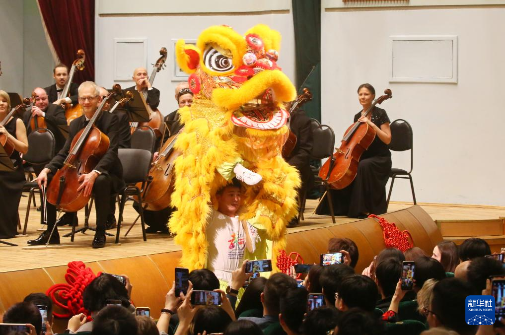 2月2日晚,2024“温暖迎春·共庆中国年”白俄罗斯华侨华人新春交响音乐会在白俄罗斯明斯克的白俄罗斯国家音乐厅举办。这是音乐会上的中国传统舞狮表演。新华社发(任科夫摄)