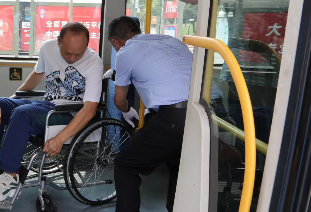 残疾人乘坐无障碍公交车
