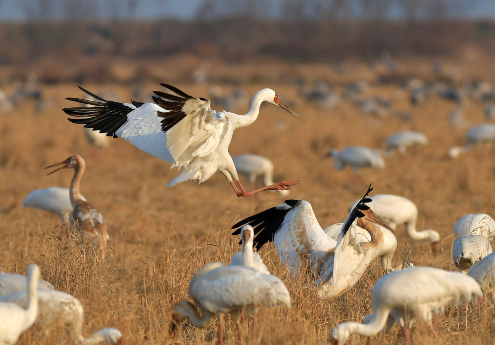 这是2021年1月15日在鄱阳湖畔的江西余干县康山垦殖场插旗洲拍摄的白鹤。随着长江重点水域生态修复措施的落实,鄱阳湖环境正发生嬗变。江西鄱阳湖国家级自然保护区管理局2022年新年伊始发布的鄱阳湖区最新鸟情数据显示,工作人员在野外监测统计到水鸟76.6万余只,创有监测记录以来新高。