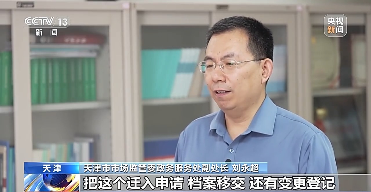 天津市市场监管委政务服务处副处长 刘永超:我们建立了企业迁移联络机制。取消申请迁出环节,把迁入申请、档案移交、变更登记三个环节整合为一个环节。