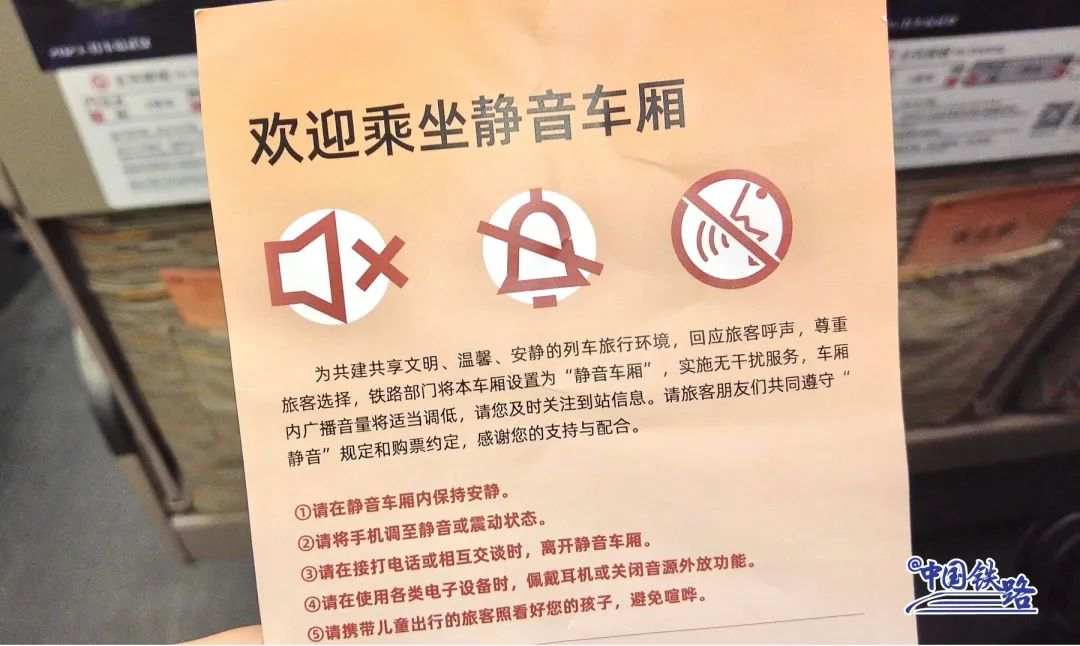 旅客朋友可通过铁路12306自主选择购买“静音车厢”车票,并遵守“静音”约定,在车厢内保持安静,使用各类电子设备时须佩戴耳机或关闭音源外放功能,将手机调至静音或震动,照看好随行儿童,避免喧哗,共建共享文明、温馨、安静的列车旅行环境。