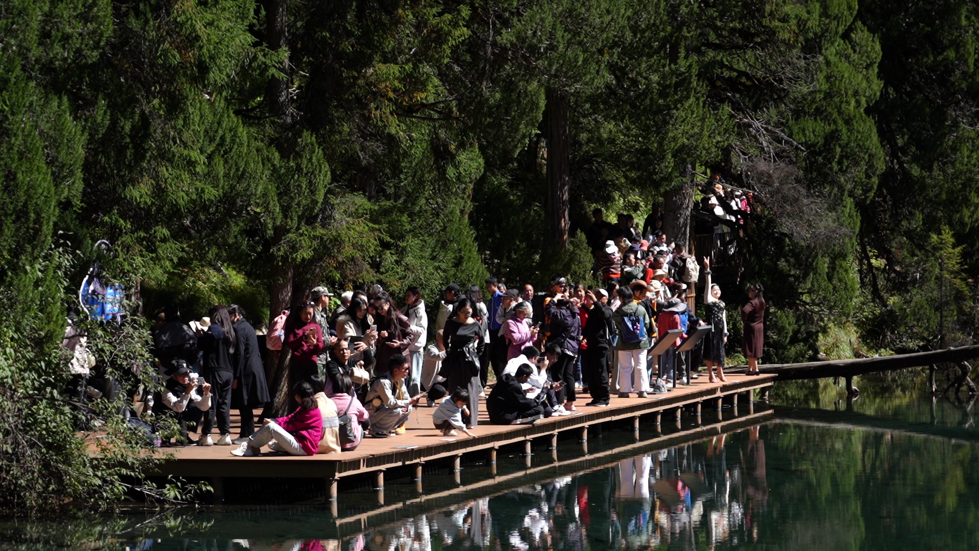 初秋的阳光穿透岷山深处的千年林海,远处高山在晴空下熠熠生辉,原始森林与碧蓝海子构成的秘境画卷,游客们首先被眼前壮丽的自然风光所震撼,纷纷举起相机,定格下林海与海子交织的壮阔全景。阳光洒在林间,光影斑驳,清澈的海子倒映着蓝天白云与四周的翠绿,空气中弥漫着杉树与泥土的清新气息。