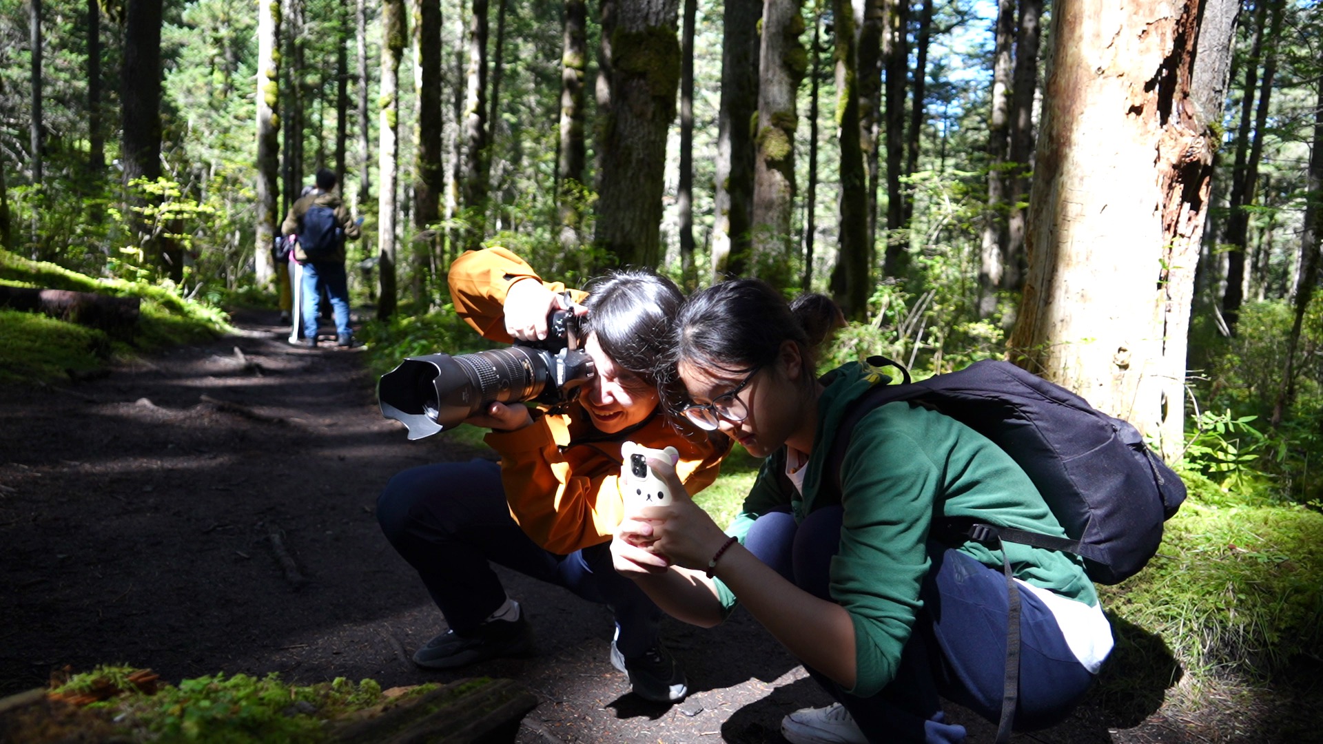 在开阔的冷杉林间,徒步的游客们放慢了脚步。阳光透过枝叶洒下,形成一道道光柱,成了绝佳的拍摄背景。人们或与巨大的冷杉合影,或专注地拍摄林间的苔藓与菌类,用镜头捕捉着原始森林的每一处细节之美。家长们也带着孩子,蹲在地上一起观察林间的植物,从这些痕迹中探寻、了解大熊猫的家园。