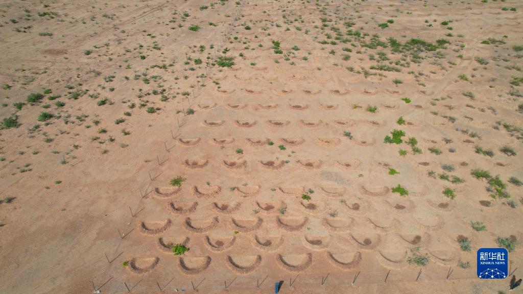 他指着面前一个个半月形土坑说,这种形状的土坑方便蓄水,有利于树苗生长。他和志愿者刚种下一棵小树苗,给这片沙地增添了一抹嫩绿。