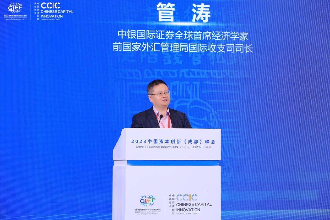 峰会现场,中银国际证券全球首席经济学家,前国家外汇管理局国际收支司司长管涛发表主题为《坚持创新发展,推动经济回升向好》的演讲。