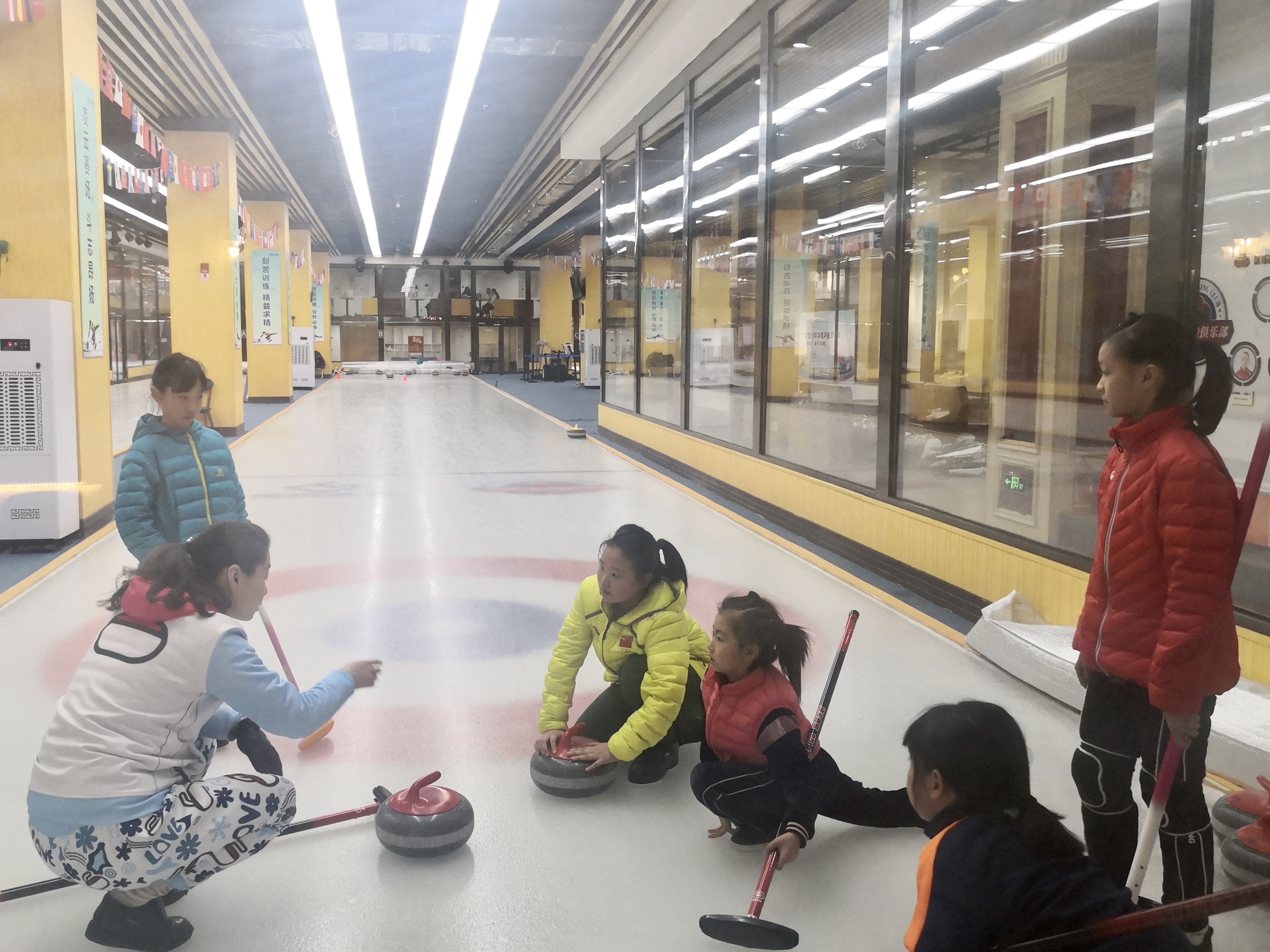 哈尔滨市实验学校二年级学生管思彤(左三)在一家冰上俱乐部训练冰壶。