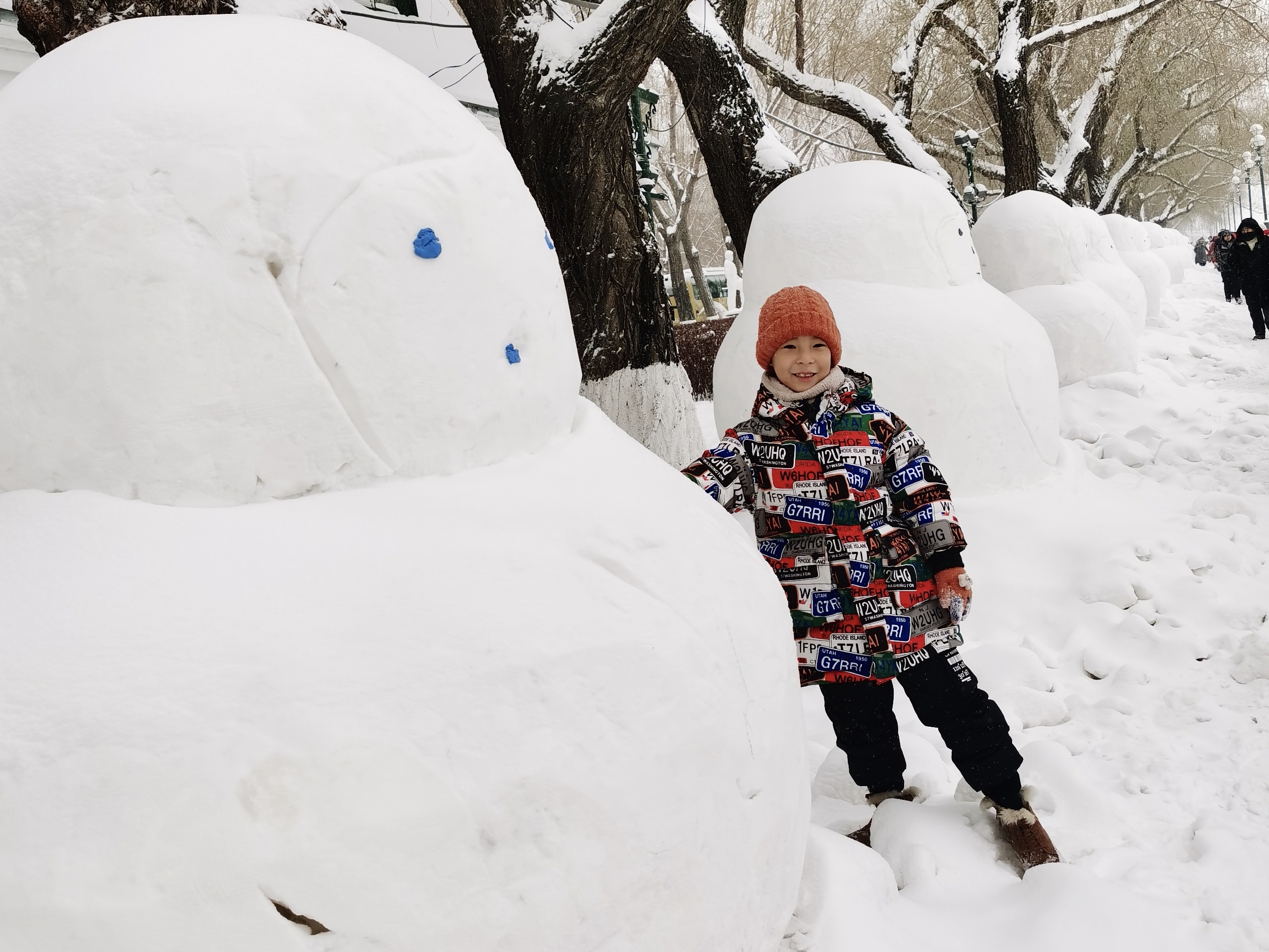 哈尔滨市铁岭小学一年级学生李炳辰与雪人合影。