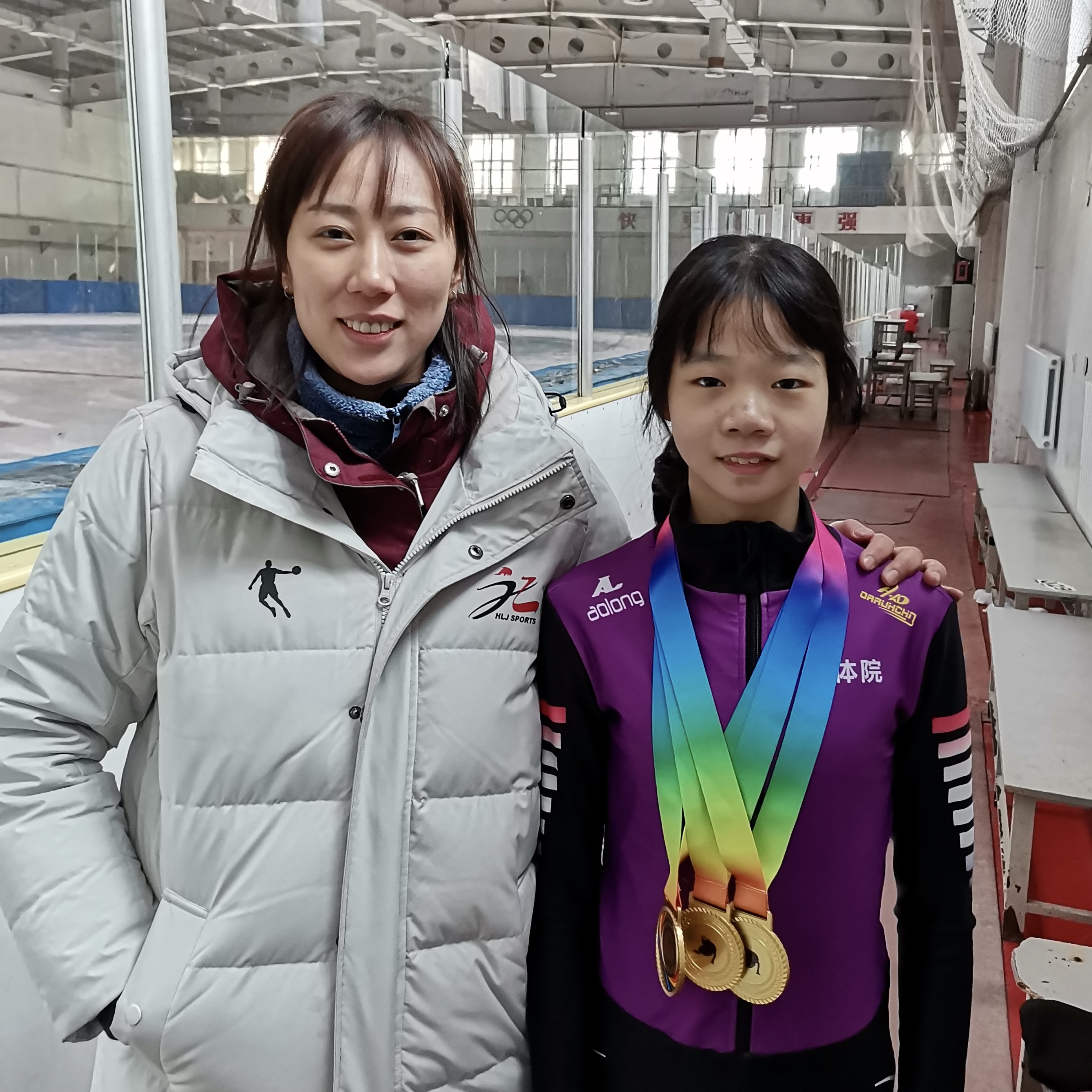 在哈尔滨市中小学短道速滑比赛中,南岗区八年级学生吕婉钰(右)获得多个项目冠军。